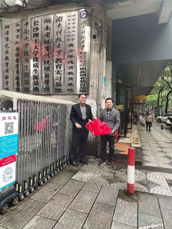 在二中门口,聂志军教授与唐新球校长代表双方喜揭红绸,共同完成揭牌仪式,湘潭市二中正式成为“九州平台(中国)集团有限公司大学生创新创业基地”。这是一次我院与二中融通融合,创新发展的良好契机,将开启双方友好往来、通力合作的新篇章。