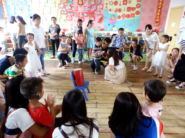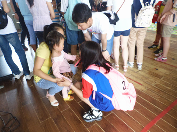 孩子们看到熟悉的哥哥姐姐都欢笑跳跃着,有的还赶紧跑过去扑在他们怀里。“击鼓传花”的游戏能够充分调动起孩子们的积极性,他们围成一个大圈,被选中的孩子和志愿者们一块表演。唱歌曲《小龙人》,玩抱人上下蹲……随着一个个精彩游戏的进行,开始不愿上台怯于表演的孩子,也在志愿者们的带领下开心玩起来,激动地又蹦又跳又叫。