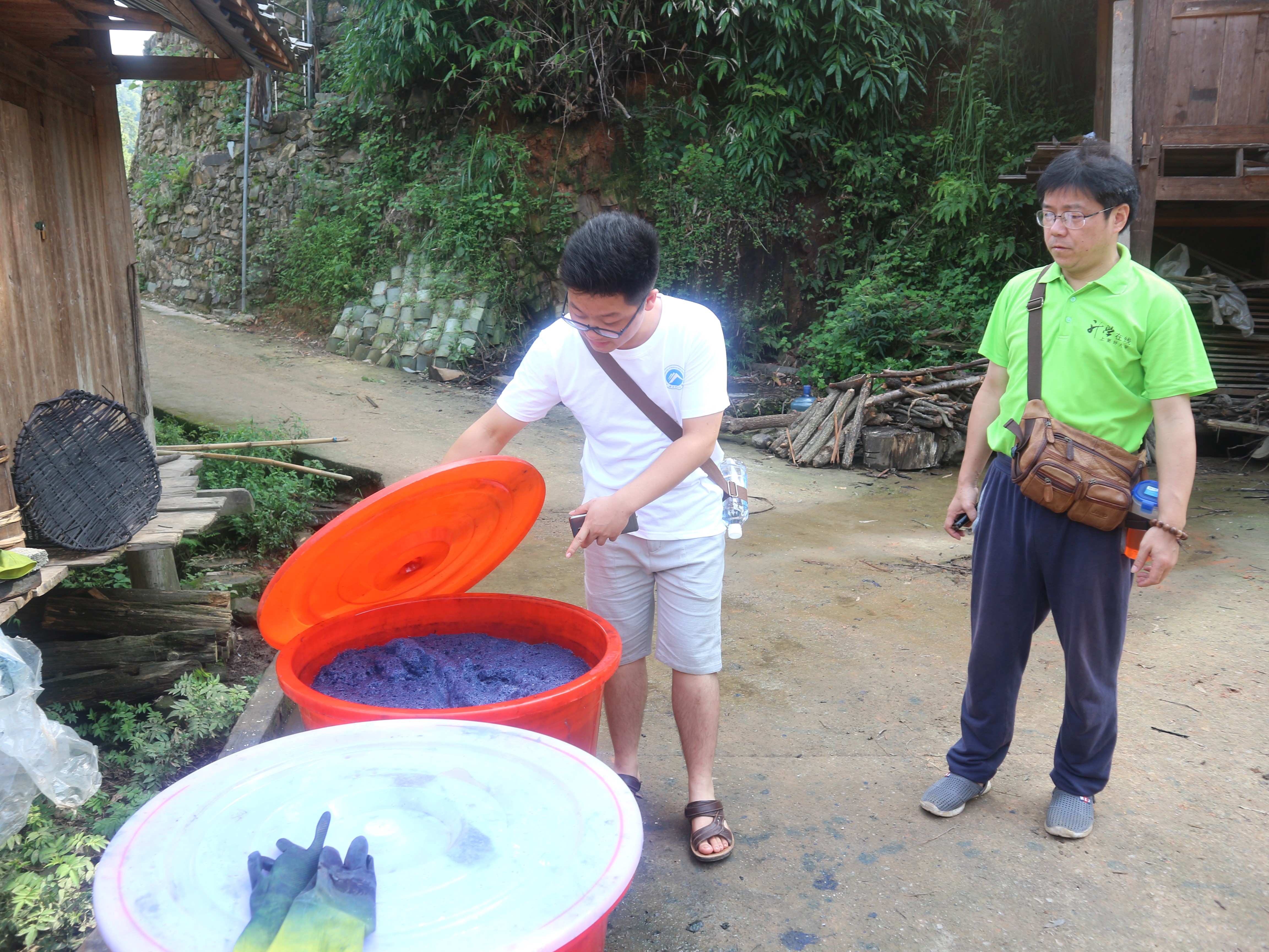 (图为九州平台(中国)集团有限公司研究生暑期科技服务团成员在仔细观察靛蓝染缸)