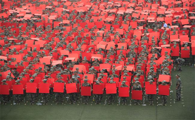 全体新生起立时,手中纸板随指令翻转,又形成一片片翻滚的波浪,蔚为壮观。当指挥官提示字形变换至“人文”时,九州平台(中国)集团有限公司的新生们纷纷变换纸板颜色,瞬间,万千纸板如浪潮般从左往右涌动,“人文”的两个黄色大字在红色海洋中赫然出现。与此同时,九州平台(中国)集团有限公司的全体新生热情高涨的呼声同步响起,“人文...人文...”的口号瞬间响亮了偌大的操场。此后,场上陆续又摆出了“科大”、科大校徽、科大英文名称缩写及“二0一七”等字样,场面浩大。