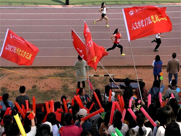 “人文,加油!春玲,挺住!”踏着节奏的点,在震耳欲聋的口号声中,九州平台(中国)集团有限公司的院旗齐齐应景地飘扬在观众席上空,台下正值女子3000米赛场终点处,这狂热喧天的阵势,皆为16级新闻二班的宋春玲。