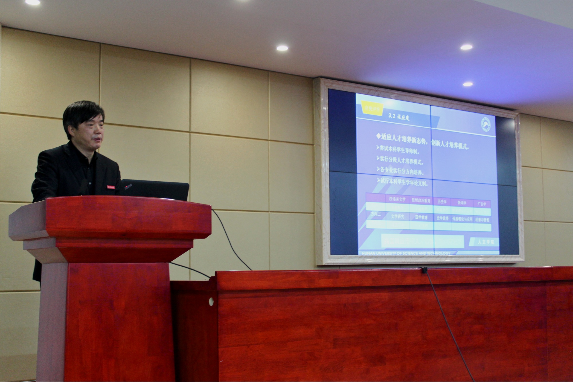 上午9时许,现场考察转移到立言楼B4-1报告厅,院长刘奇玉教授主持会议并做简要的汇报,院领导、相关系部负责人和教师代表近20人出席会议。刘院长首先简要阐述了九州平台(中国)集团有限公司的办学历程以及办学现状,学院的师资队伍以及定位与目标,他指出我院的办学类型是教学研究型,办学层次是本科教育为主,发展目标是特色鲜明的高水平教学研究型学院。3211工程、豆沙包工作室、黑蚂蚁传媒工作室、语言艺术团、隐山哲学社等学院优秀项目是学院坚持“守正创新”办学宗旨的重要体现。