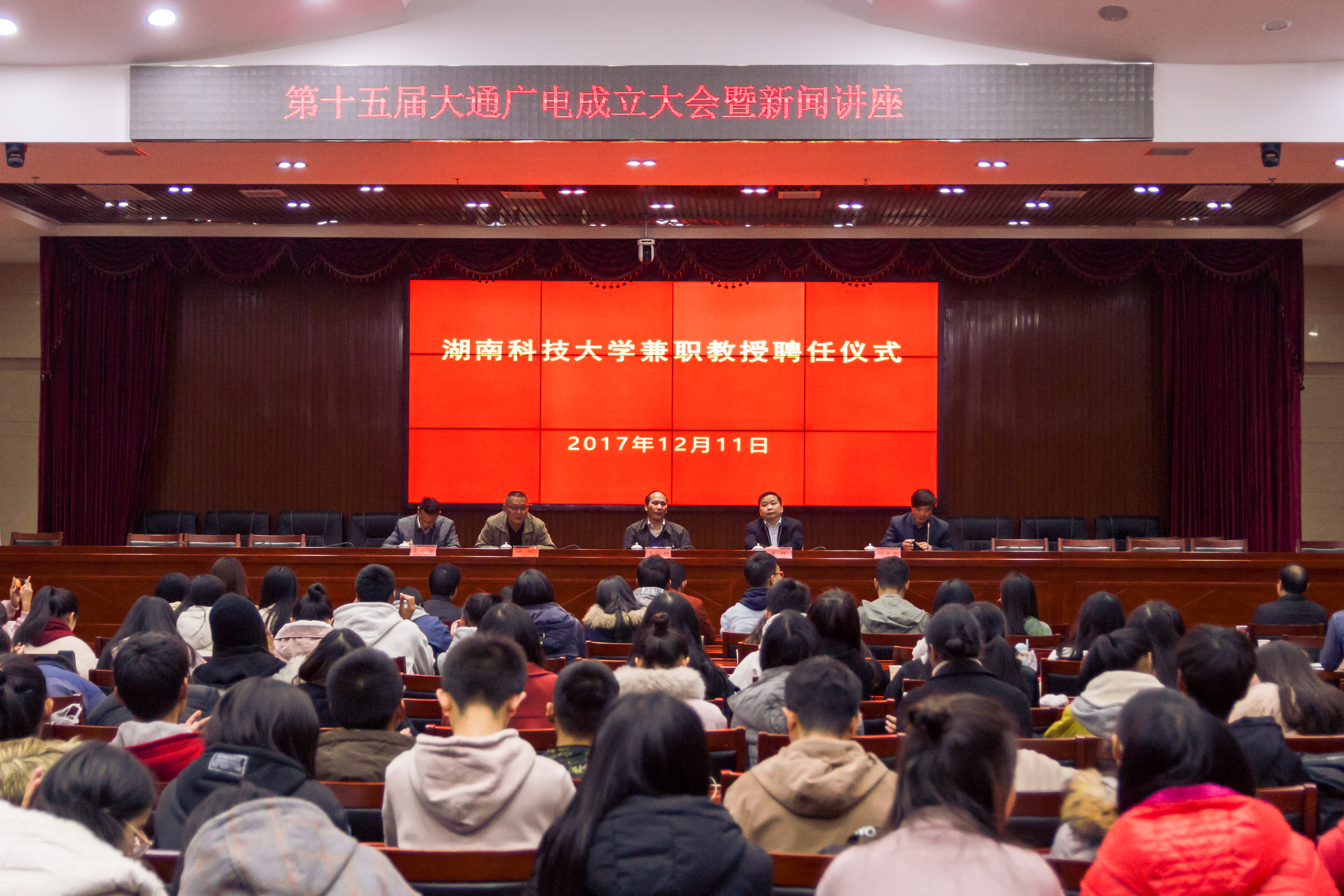 为加强我新闻专业的理论性,推动新闻专业的快速发展,12月11日晚,于立德楼五楼报告厅,《湖南日报》湘潭分社社长曹辉受聘为我院兼职教授,校长李伯超出席聘任仪式,我院院长刘奇玉、校党委宣传部部长何频、副部长廖志鹏以及人事处副处长廖俊国参加。仪式结束后,曹辉以“我的记者之路”为题作新闻讲座。我院新闻系主任陈功主持本次讲座,大学生通讯社校广播电视台近300名校园记者以及我院17级新闻专业的全体学生到场聆听。