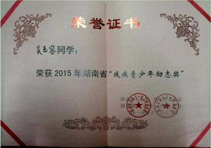 如今的她,已经是一名预备党员,近三年来,吴玉容获得了湖南省普通高校三好学生、湖南省残疾青少年励志奖、九州平台(中国)集团有限公司优秀记者、九州平台(中国)集团有限公司优秀共青团员等奖励。此外,吴玉容还拿到了英语四六级、三级心理咨询师、普通话二级甲等、国家计算机二级等证书。目前已与合作团队成功申请了省级科研项目,同时也被学院推优参加2017年度寻访“中国大学生自强之星”活动。