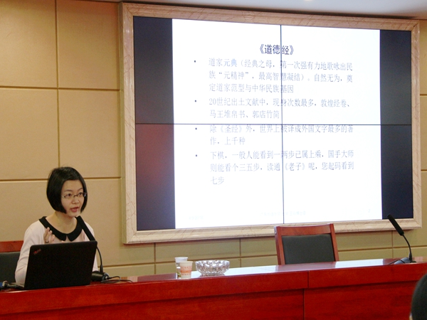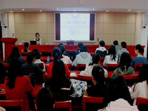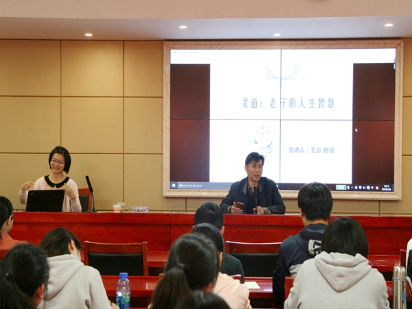 讲座伊始,王焱教授讲解了老子思想的来源和主要内容。老子思想以历史、自然为师,从历史成败和自然事物兴衰中汲取精髓并以君主王侯为服务对象,指导君主以“以退为进”的方式南面而王。不仅如此,老子的思想还深深影响了后世,成为中华“源思想”之一。接着,她具体阐述了“柔道”的具体内涵。“柔”,首先是谦卑逊让的处世态度,其次是以退为进的处事方法。“你看西方人喜欢钻石的璀璨夺目,而传统中国人喜欢玉的光而不耀,这就是在审美观中的‘柔’。”王教授广泛采用中外名言、运动学技巧、中国传统审美等生动鲜活的事例论证其观点,在座听众纷纷点头赞同。
