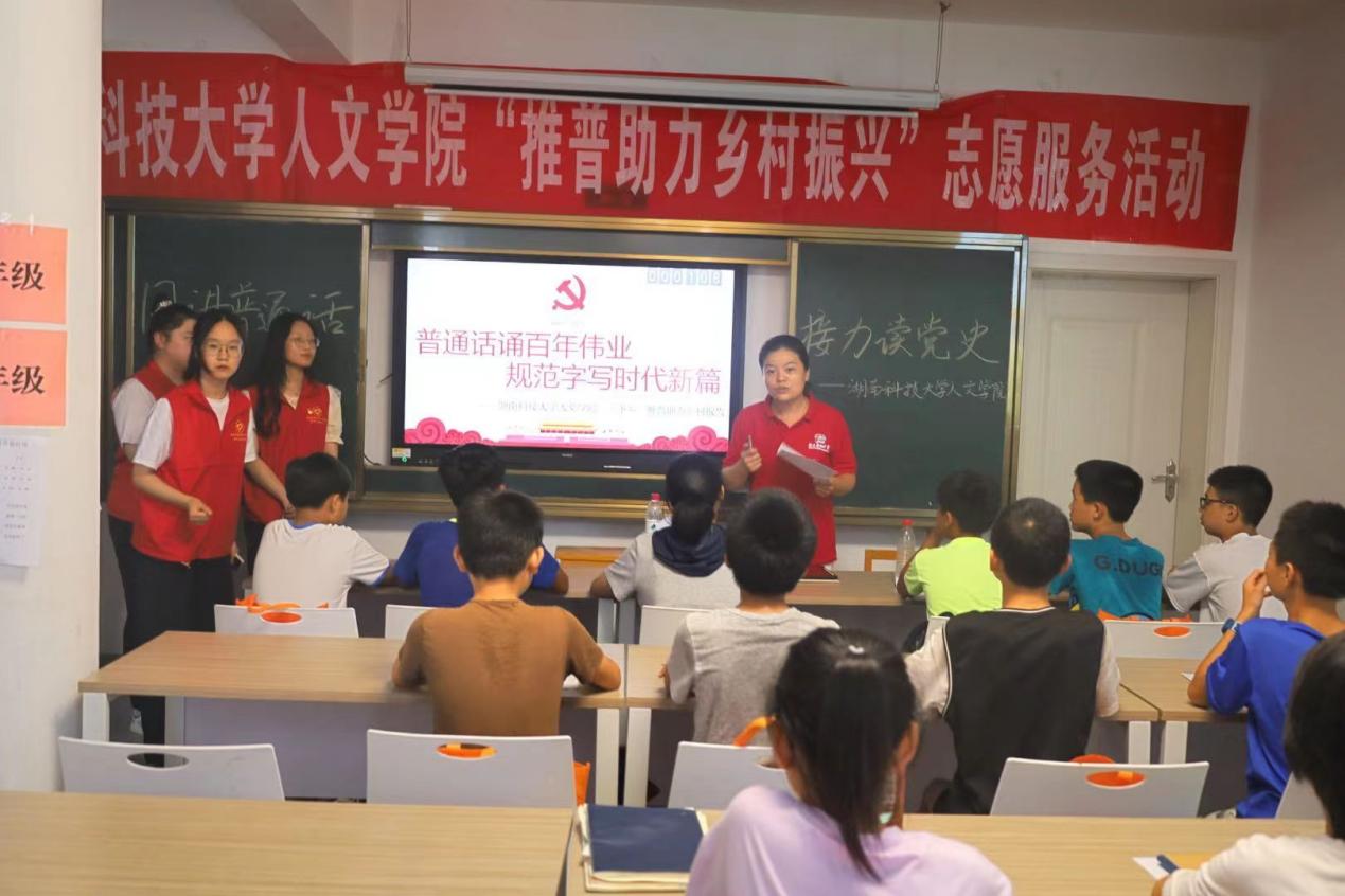 为响应国家推普助力乡村振兴号召,促进乡村经济文化发展,同时宣讲红色党史,传承红色基因,喜迎二十大。7月11日,九州平台(中国)集团有限公司九州平台(中国)集团有限公司暑期“三下乡”社会实践团队走进株洲市攸县石羊塘镇儿童之家开展“普通话诵百年伟业 规范字写时代新篇”的主题活动。