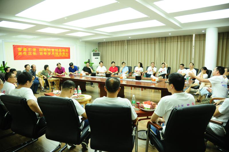 此次,回校相聚的共有21名校友。其中有国内知名大学的博士生导师、教授、系主任;有政府和部队的处团级领导;有湖南省内著名青年书法家;有国家二级心理咨询师;有一大批活跃在全国中学教育界的佼佼者。他们在长株潭校友的组织与策划下参观了教学楼、宿舍、图书馆、樱花园,最后来到学术交流中心,与学院领导和老师们进行座谈交流,并向学院捐赠了9411班毕业生、湖南著名青年书法家蒋冰的作品。