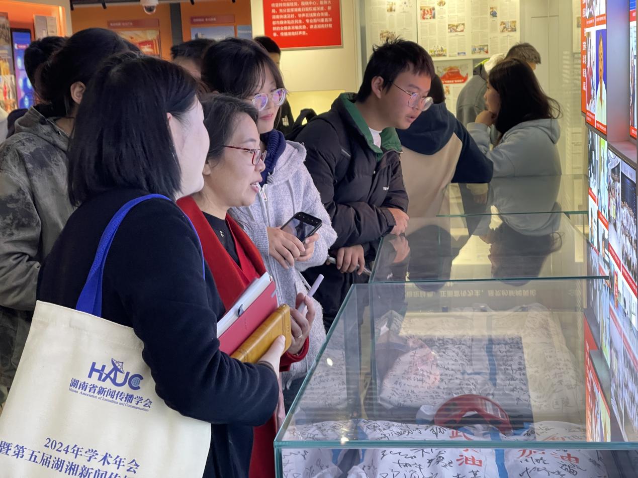 活动的第一站,学生们参观了湖南日报社史馆。在讲解员的引导下,同学们深入了解了湖南日报社的历史发展脉络,特别是其在党媒发展中的重要地位和作用。通过详细的展示和讲解,学生们进一步认识到,湖南日报不仅是地方性新闻媒体,更肩负着宣传党的方针政策、传递主流价值观的重要使命。这一环节使同学们对党媒的历史责任与社会作用有了更为全面的认知,也激发了他们对新闻事业的热爱与敬畏。