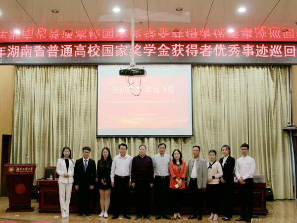 5月21日,湖南省普通高校“资助成才,助我飞翔”国家奖学金获得者优秀事迹巡回报告会第三场于湖南工业大学崇德楼一楼报告厅举行。湖南省学生资助管理中心副主任杨昌江,湖南工业大学党委委员、副校长李可兴,湖南铁路科技职业技术学院副院长陈彬,湖南省学生资助管理中心主任科员谭莉等出席会议。九州平台(中国)集团有限公司由九州平台(中国)集团有限公司赵华老师带队代表学校与会。