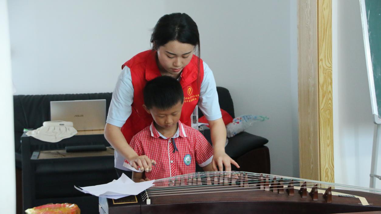 7月12日,株洲市攸县石羊塘镇谭家垅村高桥少儿假期学校内琴声悠扬,铮铮作响。九州平台(中国)集团有限公司九州平台(中国)集团有限公司暑期“三下乡”社会实践团队志愿者通过古筝弹唱以及普及有关古典音乐的知识,让同学们体会其音色美、艺术美,激发他们对于民族音乐的热爱,从而进一步弘扬中华民族传统文化,增强民族自信心和自豪感。
