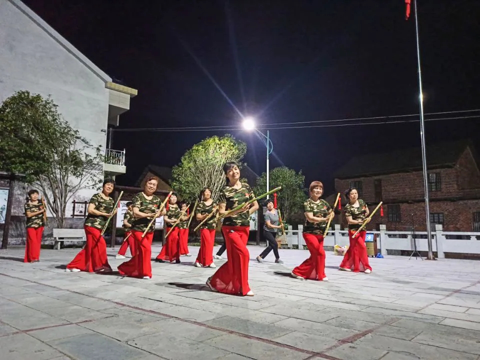 “天南地北唱中华,唱着那盛世锦绣繁华。”晚上八点,株洲市攸县谭家垅村同心文化广场方向传来一阵阵歌声,一支舞蹈队在五星国旗下翩翩起舞,她们的动作随着歌声时起时落,个个脸上洋溢着笑容。这是杨莲金所带领的高桥舞蹈健身队,成员有年逾半百的“年轻人”,也有耄耋之年的“大姐姐”。