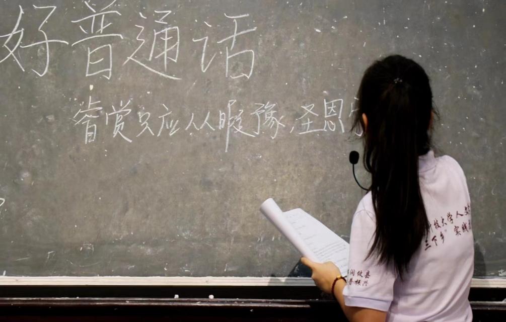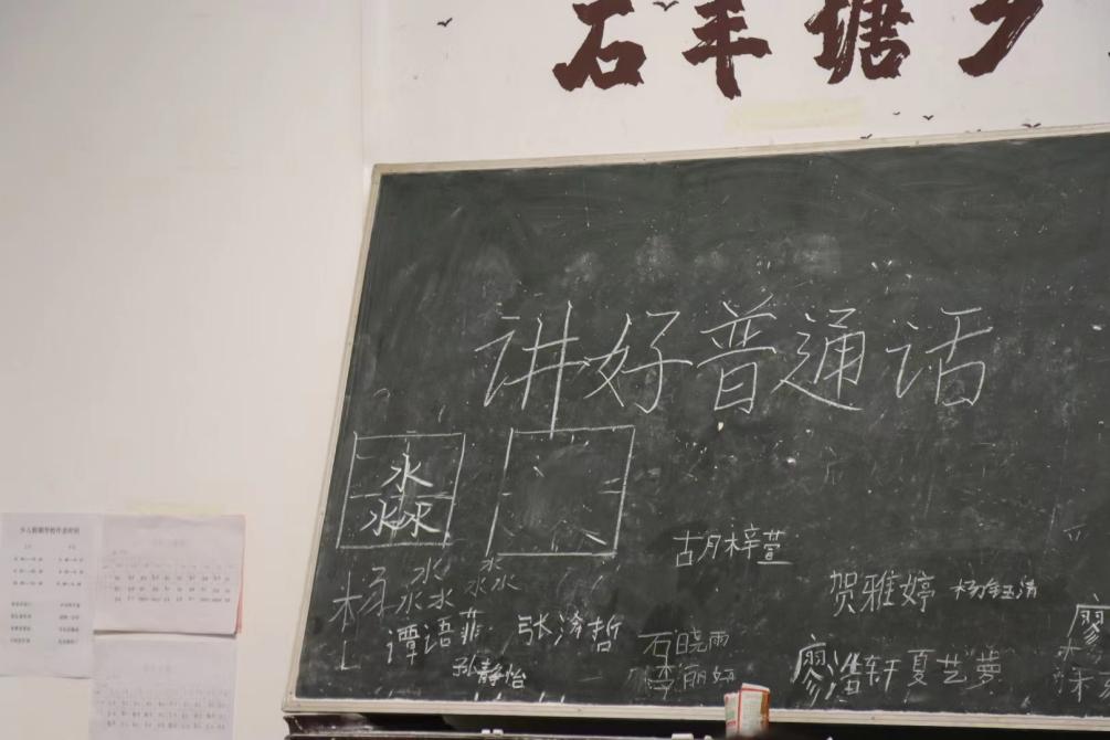 “同学们,让我们用标准的普通话朗读诗歌,用正确的中国字写出藏在诗歌里的名字。”李佳琪在黑板上一笔一画地写下同学们姓名的规范字形,同时带领学生们领读古诗词,“淼淼望湖水,青青芦叶齐。同学们快看看是我们班哪位小朋友的名字呀?”老师话音刚落,只见学生们都回头看向一个小女孩。小女孩一脸自豪地大声回复老师:“是我的名字!张淼淼。”随后张淼淼同学跟着老师在黑板上写出正楷体汉字,看到有不对的地方,老师便纠正笔顺,并让孩子们用流利的普通话大声朗读诗词。