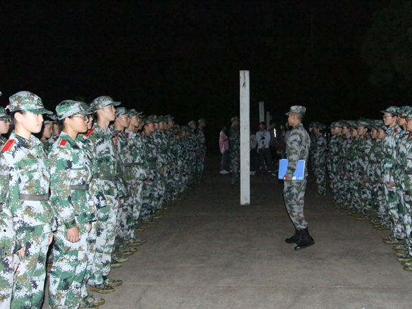 在助班的带领下,新生们早早地来到训练场地整理好队伍,等待教官的到来。晚上7时,各排教官准时来到训练场地。集中完毕后,连长王阳首先作了自我介绍:“我姓王,单名阳,你们看到太阳的时候就是训练的时候。”他指出近期新生中存在的自由散漫等问题并提出五点要求:时刻注意军容军纪,请假时严格遵循程序,弘扬集体主义精神,能够吃苦耐劳,注重礼貌礼节。“当你们穿上军装,你们就不再是学生,而且中华人民共和国的一名预备军人,要用军队的要求来严格要求自己!”,王阳简述了自身在部队中学习到的精神,并以此激励新生不畏艰难,“军队的精神就是,没有困难克服不了,没有敌人战胜不了,没有任务完成不了!”在简单提问以确保新生熟记纪律后,王阳再次强调了请假问题,并补充说明军训不是为了折腾学生,而是为了考验受训者的毅力和耐心,锤炼出军人般的意志,最终将军训中学习到的品质落实到生活中。
