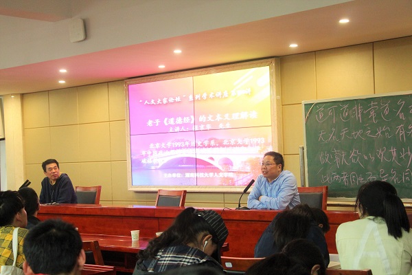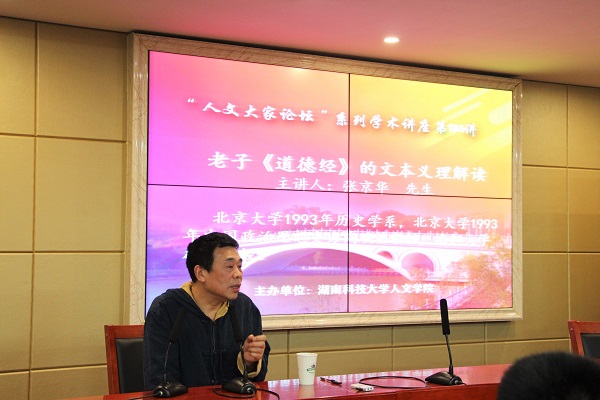 4月17日晚,湖南科技学院张京华教授应邀前来我校九州平台(中国)集团有限公司做了一堂题为“老子《道德经》的文本义理解读”的精彩学术报告。本次讲座由我院党委书记廖加林教授主持,我院吴广平教授、王友胜教授、张晚林教授、颜中军、胡忆红、余霞、胡红梅、龚超等老师及文、史、哲等专业的100多为本科生、硕士研究生到场聆听。