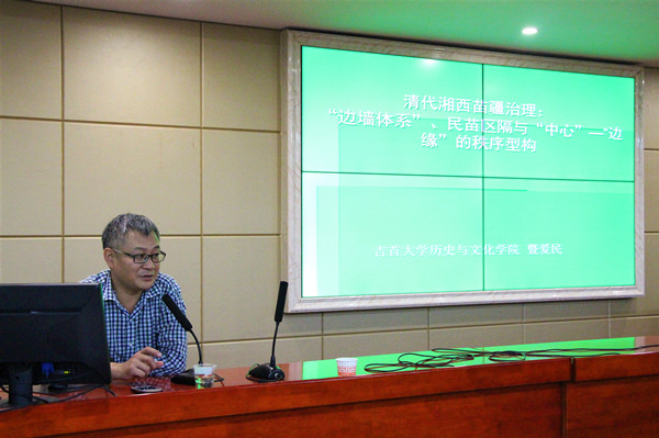 6月13日晚,“人文大家论坛”系列学术讲座第193讲在立言楼B4-1顺利举行。吉首大学历史与文化学院教授暨爱民应邀来我院作《清代湘西苗疆治理:“边墙体系”、民苗区隔与“中心”-“边缘”的秩序型构》的学术讲座。讲座由徐红教授主持,我院副院长欧阳萍、周方高教授、廖君湘教授以及17、18级历史系全体同学和研究生到场聆听。