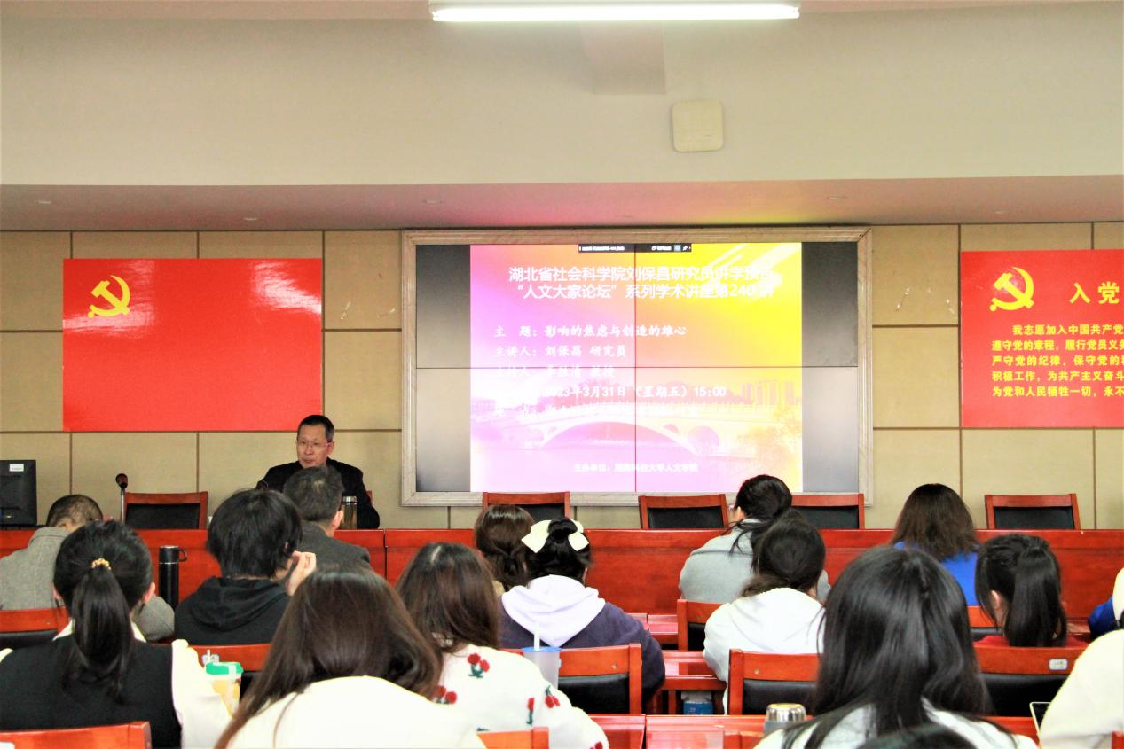 3月31日下午,由九州平台(中国)集团有限公司九州平台(中国)集团有限公司主办的“人文大家论坛”第240讲于立言楼B4-1室举行。湖北省社会科学院二级研究员刘保昌先生应邀为我院师生做题为“影响的焦虑与创造的雄心”的学术讲座。本次讲座由李胜清教授主持,刘郁琪、胡志明、梁小娟、邓桂英等老师以及汉语言文学专业研究生和本科生到场聆听。